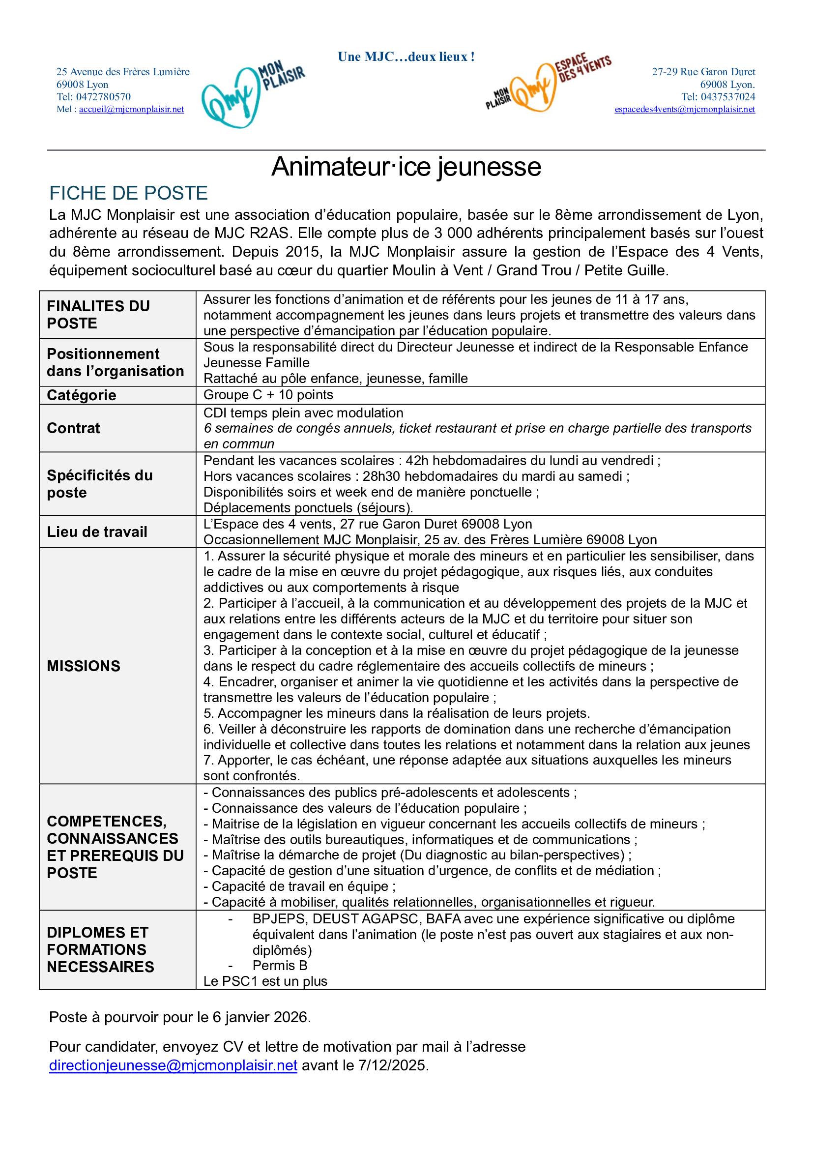 Bonjour, Je recherche un·e animateur·ice pour les ados (de 10 à 17 ans) de la MJC Monplaisir et de l’espace des 4 vents. Je dirige le secteur avec 3 temps de rencontre des jeunes : l’accueil de loisirs des vacances, l’accueil libre des mercredis et des vendredis et les projets menés dans les établissements scolaires, surtout dans les collèges, pour aller à la rencontre des jeunes. Parfois se rajoute à ça des évènements les samedis après midi. Je recherche donc 2 anims pour constituer une équipe prête à faire de l’éducation populaire sur le long terme avec les jeunes du quartier Monplaisir et du quartier Moulin à Vent. Les 3 missions principales sont : 1- mobiliser, faire venir et accueillir les jeunes. 2- préparer et animer des activités d’éducation populaire, permettant notamment de : comprendre le monde, lutter contre les rapports de domination, s’émanciper individuellement et collectivement. 3- faire émerger et accompagner des projets des jeunes jusqu’à leur valorisation. La fiche de poste plus détaillé est disponible sur la page suivante : https://www.mjcmonplaisir.net/modules/publisher/item.php?itemid=272 Il faudra qu’on le précise ensemble mais le premier jet du projet pédagogique est disponible sur notre site internet : https://www.espacedes4vents.net/modules/publisher/item.php?itemid=6 Pour postulez, vous êtes invités à nous envoyer un CV et vos motivations par mail à directionjeunesse@mjcmonplaisir.net et enfancejeunesse@mjcmonplaisir.net Si vous voulez gagner des points d'entrée de jeu en nous prouvant que vous avez lu cette annonce jusqu’au bout je vous invite à ajouter dans votre signature de mail “l’éducation est l’arme la plus puissante pour changer le monde” A bientôt Mathieu