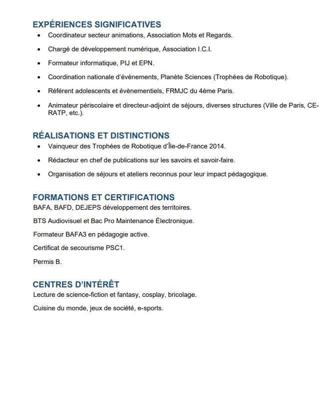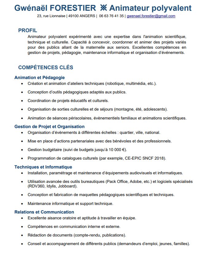 Bonjour. Voici mon CV compact qui va à l'essentiel d une grande partie de mon parcours professionnel en tant qu'animateur socioculturel professionnel. Je reste disponible pour tout entretien téléphonique pour préciser le contenu de ce CV. Cordialement GF