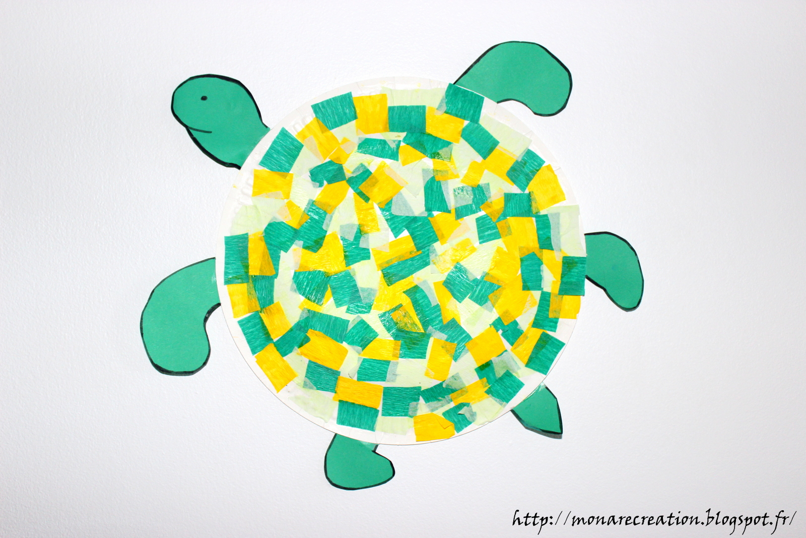 J'ai réalisé une tortue avec une assiette en carton (l'assiette devient la carapace) avec les 4-5 ans. Ils ont ensuite recouvert la carapace de petit morceau de papier crépon à l'aide de colle blanche. Une fois terminé ils ont collé les parties du corps de la tortue (soit en la coloriant soit en utilisant une feuille de couleur verte).  Puis on colle les parties du corps de la tortue à la carapace et hop finit !